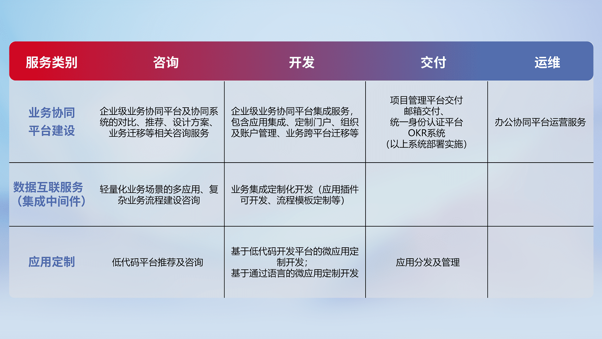 针对钉钉、、、、企微、、、、IDaas等平台级产品提供产品的规划、、、方案、、、交付、、、定制化开发等服务,,实现如统一协同办公、、、、智能客户服务、、、混合会议管理、、智能数据查询、、等业务场景,,,,实现数字化转型。。。。